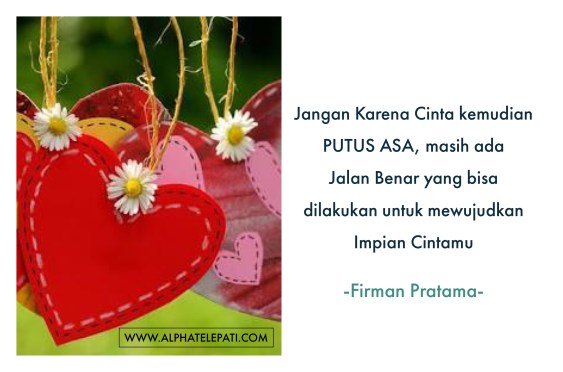 Tulisan saya kali ini ingin berbagi solusi bagi anda yang memang memiliki persoalan cinta, misalnya ditinggal kekasih pergi, ditolak cintanya, merasa hanya bertepuk sebelah tangan atau masih awal mau pe-de-ka-te dengan target, seperti yang tadi pagi menghubungi saya. Seorang gadis dari palembang, dia menelepon saya lalu cerita ” mas firman, terima kasih kekasih saya kembali dan mau menikahi saya, setelah 6 bulan saya kerjakan alpha telepati sesuai saran mas sambi ngerepotin mas firman juga, makasih mas, nanti saya mau ajak suami untuk belajar AMC biar kita hidupnya sukses”.