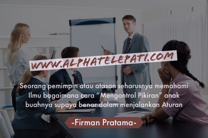 Seorang pimpinan, seorang pemilik bisnis, seorang bos, atau manager bukan hanya sibuk membaca dan mempelajari ilmu leadership atau kepimpinan tapi juga wajib memahami ilmu Alpha telepati dan Alpha mind control agar mudah dalam mengendalikan pikiran anak buahnya tanpa perlu capek-capek bicara, dan yang terpenting agar tidak menjadi target alpha telepati oleh anak buahnya. Karena seharusnya masing-masing orang mengontrol sendiri pikirannya, tapi bagi yang belum memahami cara mengontrol pikiran dengan AMC maka ya siap-siap saja dipengaruhi oleh orang lain. Maka Saatnya anda untuk memahami Alpha telepati sebagai langkah awal untuk mempelajari Alpha Mind Control dengan utuh.