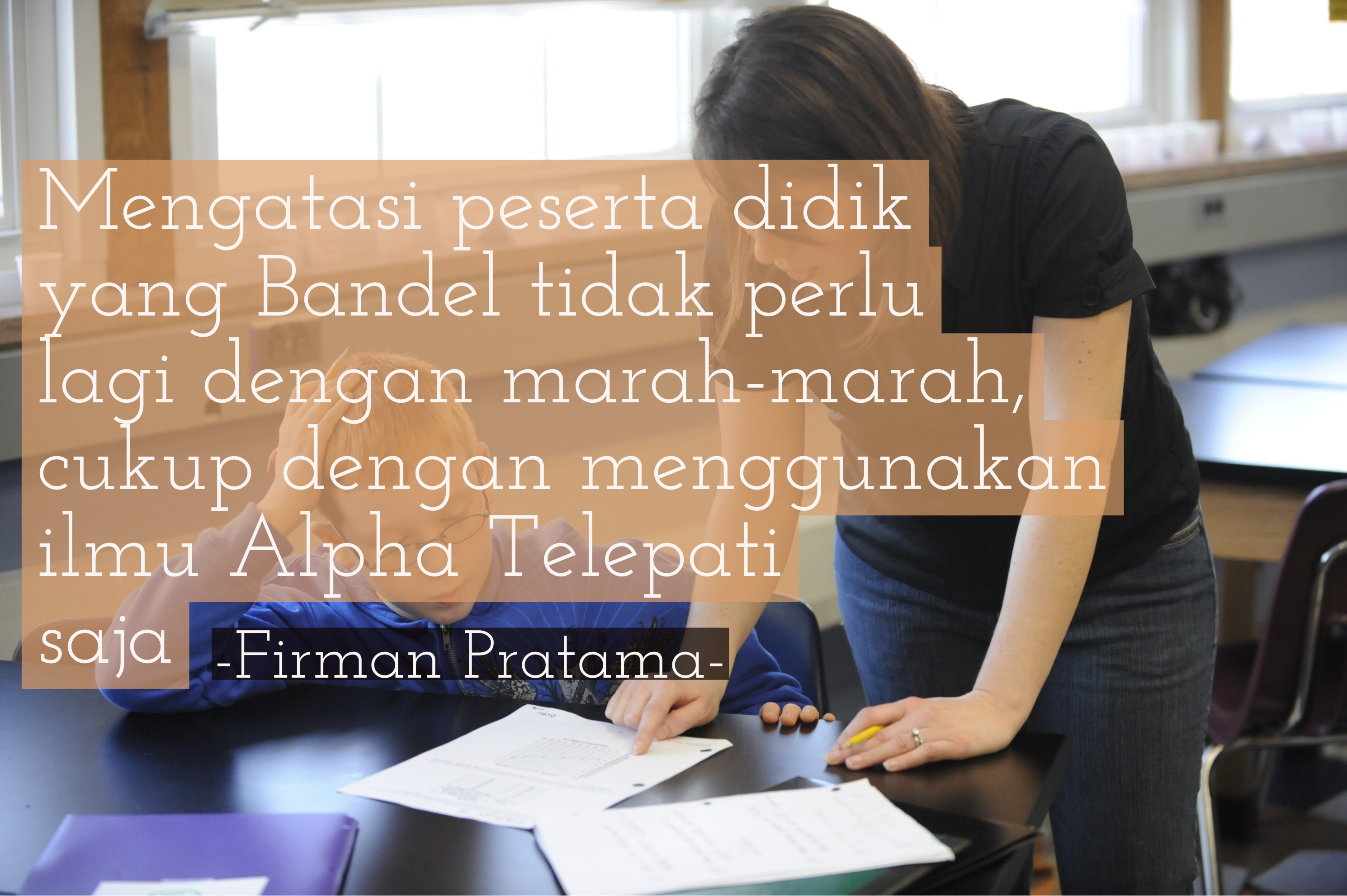 Tulisan ini saya tujukan buat para guru di Indonesia, yang memang sudah seharusnya mempelajari dan memahami Alpha Telepati dan menerapkannya dalam lingkungan sekolahnya masing-masing. Sehingga para guru menjadi mudah dalam “mengatur” peserta didiknya, ketika peserta didik menjadi menurut kepada guru-guru maka pasti bisa mengurangi kejadian-kejadian penganiayaan guru oleh muridnya.
