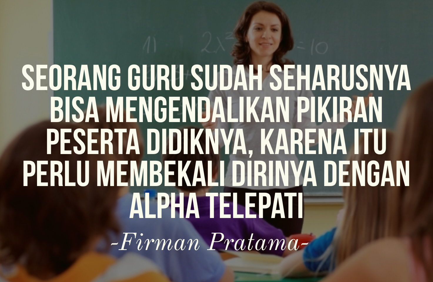 Memang sebagai seorang guru seharusnya membekali diri bukan hanya dengan ilmu mengajar atau ilmu mendidik saja, tapi dilengkapi dengan ilmu untuk mempengaruhi orang lain supaya mudah menerima apa yang diajarkan. Sebagai seorang pendidik juga (dosen universitas), maka saya juga menerapkan ilmu alpha telepati ini dalam mengajari para mahasiswa dan hasilnya saya begitu mudah dalam mengajar di kelas. Karena itu sebagai sesama pengajar maka saya membuat metode Alpha Telepati ini sehingga mudah dibaca dan dipahami oleh anda para guru.