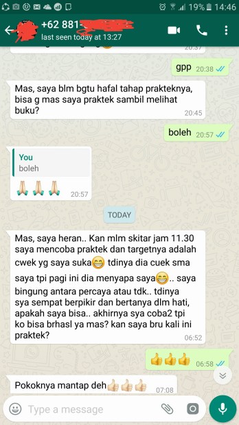 Setelah mas ini membeli buku alpha telepati kemudian membacanya dengan benar, lalu dia mempraktekkan apa yang ada di buku alpha telepati itu, dan dia pun mengirimkan pesan ke saya bahwa cewek yang awalnya cuek itu sudah perhatian, sudah mau menyapa duluan. Padahal awalnya kalau bertemu seperti membuang muka, tentu si mas ini merasa ajaib dengan perubahan sikap dari cewek yang dia taksir itu. Sehingga terbukti bahwa untuk membuat cewek cuek menjadi perhatian itu mudah dan praktis dengan menerapkan teknik alpha telepati, karena memang jika ingin mengubah pikiran orang lain harus dengan kekuatan pikiran juga supaya orang itu merubah sikapnya secara alami tanpa dia sadari.